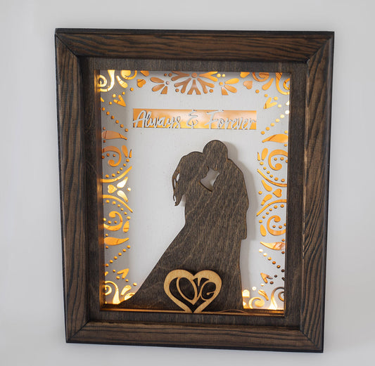 Our illuminated shadow boxes are 8" x 10" in size. They are battery-powered with a string of warm white 60 LED lights that are dimmable and can be set to perform 8 unique lighting functions from steady on to twinkling, slow fade or a variety of other chasing options.