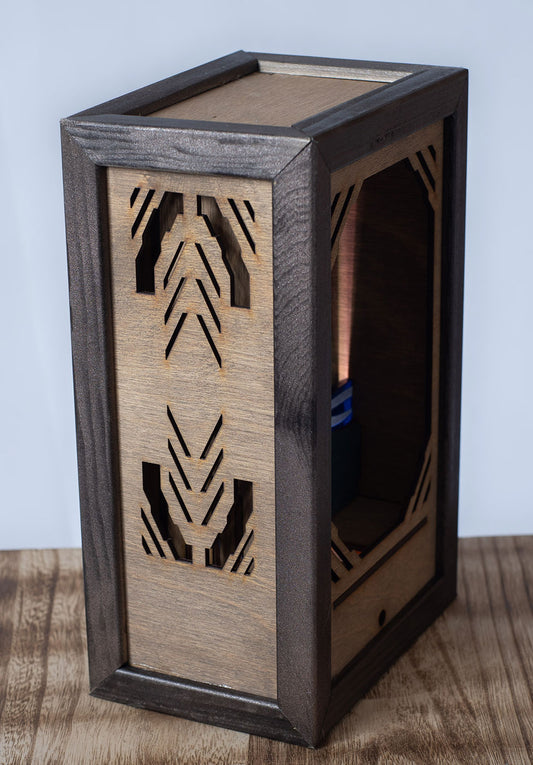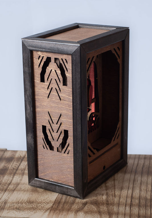 Each shadow box has several layers of carved wood and/or a heavy card stock with lights woven between each layer to illuminate the scene. The battery pack that powers the lights is tucked into the shadow box so these can be set on a desk/table or hung on a wall.