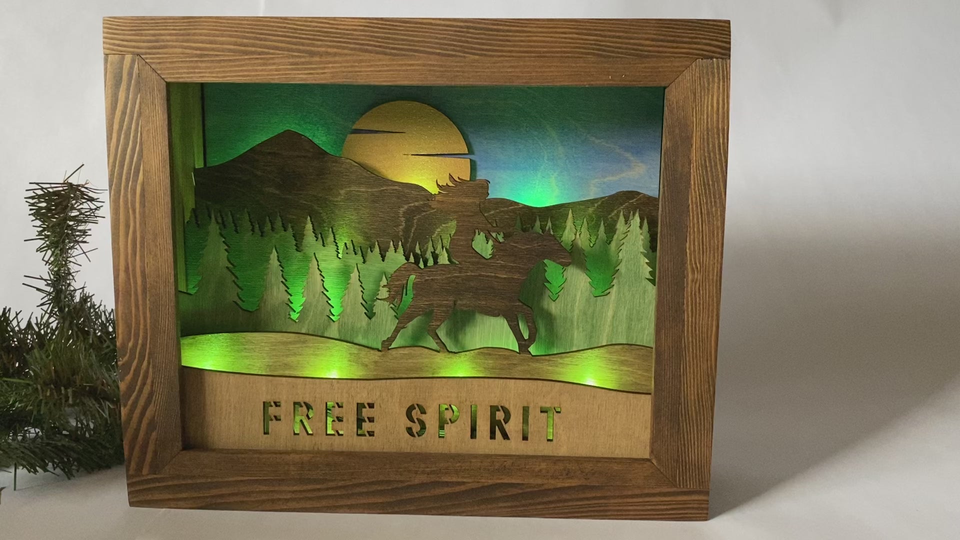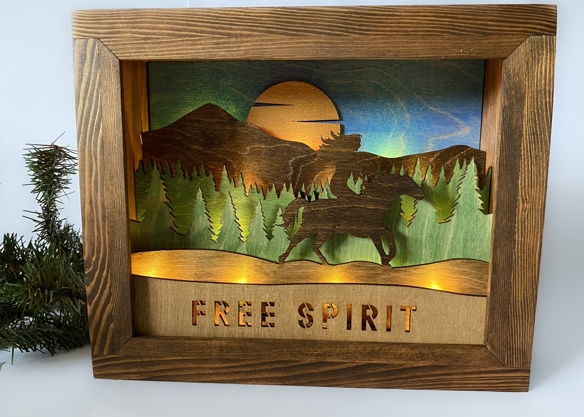 The "FREE SPIRIT" shadowbox art piece is a favorite among spirited, and adventurous young women and those who are still young at heart! This piece features a gallant young woman riding her stallion bare-back through the forest, in front of a mountainous backdrop and a clear blue sky. The artwork consists of seven layers of scenery accented by LED lighting. The words "FREE SPIRIT" are carved into the front panel allowing the light to pass through each letter.