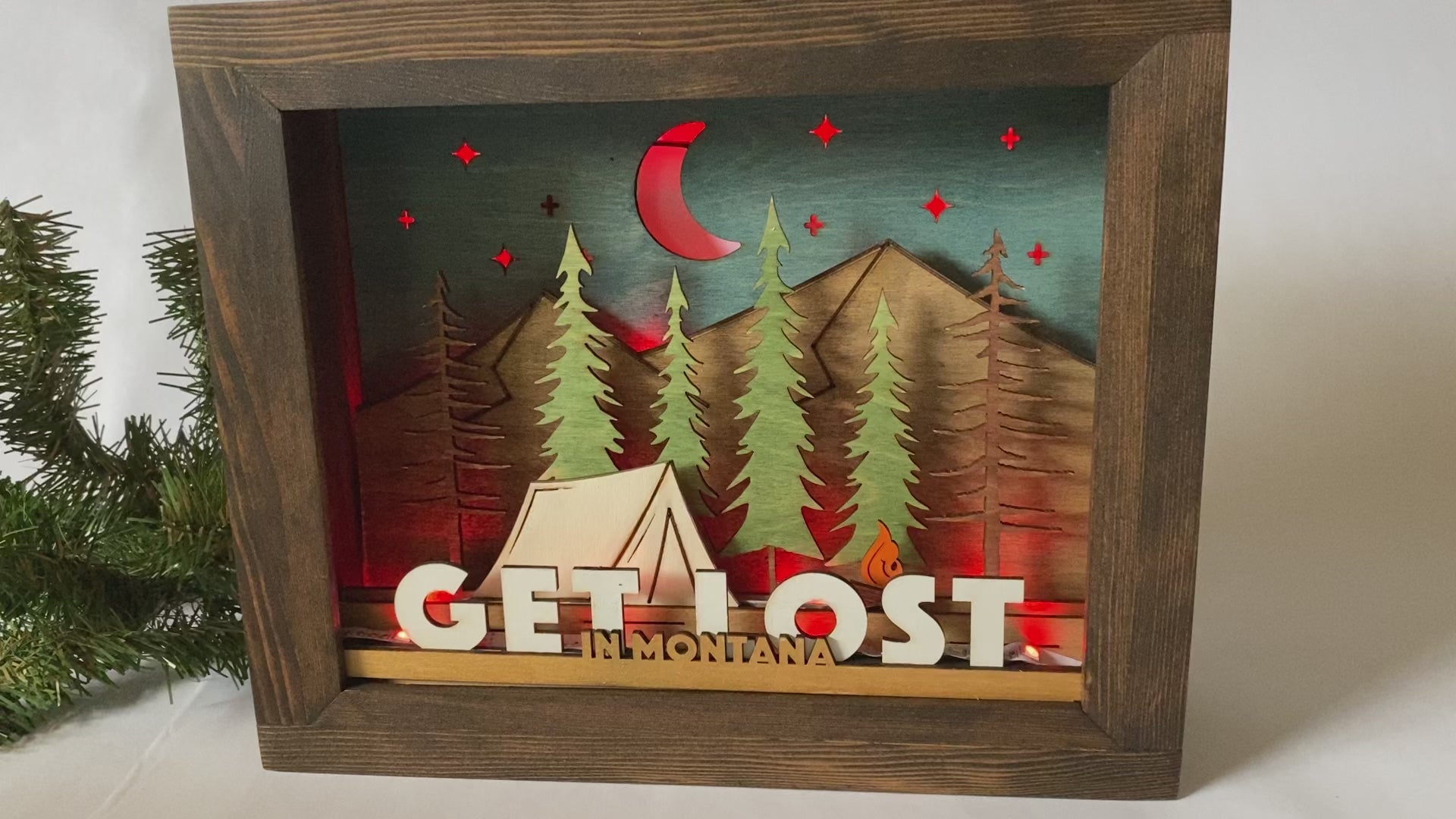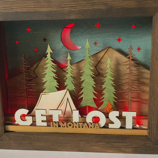 The "GET LOST" shadowbox brings you inside a back-country campsite where a canvas tent and a roaring campfire, sit quietly-hidden amidst a tranquil forest in the rocky mountains, underneath a twilight sky full of shining stars and a crescent moon. At the front of the scene the words "GET LOST" are written in large white block lettering with "In Montana" written in smaller gold block letters in front.